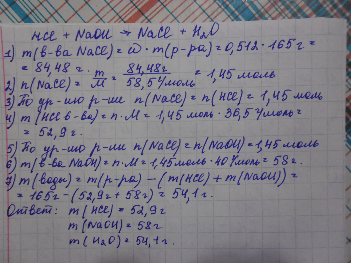Определите массы соляной кислоты с массовой долей HCl 31.2%, раствора с массовой долей гидроксида натрия 24,2% и воды, которые необходимы для приготовления раствора массой 165 г с массовой долей хлорида натрия 5,12%.