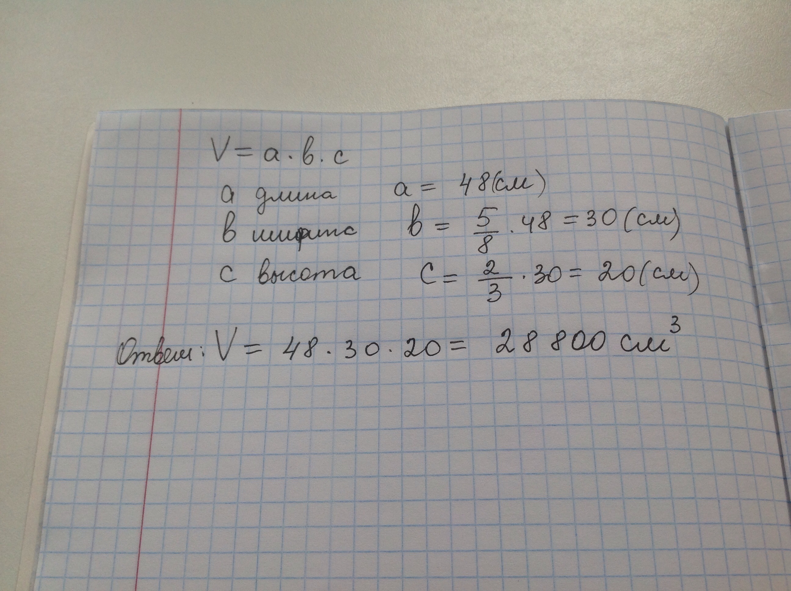Длина прямоугольного параллелепипеда равна 48 см,ширина составляет 5/8 длины,а высота 2/3 ширины. Вычислите объём параллелепипеда