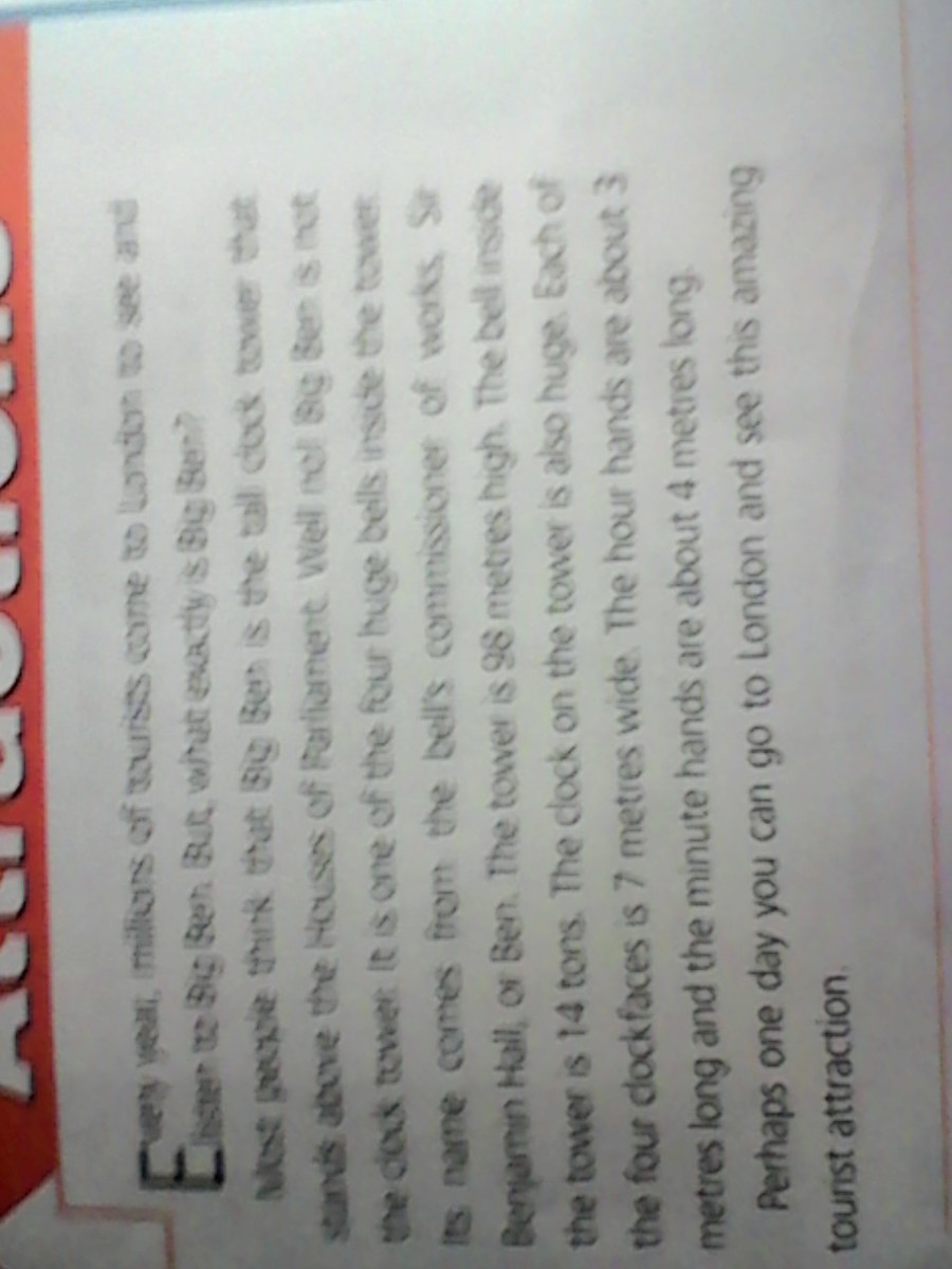Большинство людей считают, что Биг Бен - это высокая часовая башня, которая расположена около Дома Парламента. Вот и нет! Биг Бен - это небольшая часовая башня. Это название четырёх больших колоколов внутри башни. Его имя происходит от бывшего члена комиссии парламента, Сэра Бенджамина Хэлла или просто Бена. Высота башни - 98 метров. Колокол внутри башни весит 14 тонн. Часы на башне также имеет большие размеры. Каждый из четырёх циферблатов 7 метров шириной. Каждая часовая стрелка длиною в 3 метра, а минутная стрелка длиною в 4 метра.