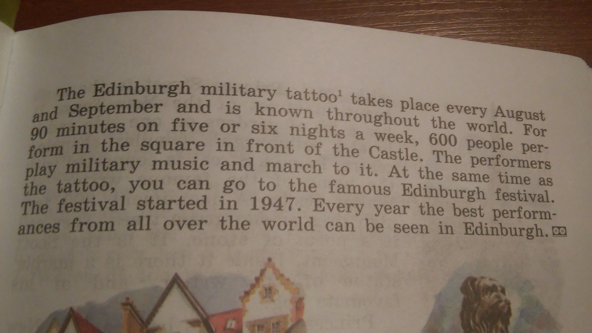 Шотландия является страной, в Соединенном Королевстве, на севере Англии. Ее символом является чертополох, его покровителем является святой Андрей. Страна разделена на возвышенности и низменности. Большая часть промышленности сосредоточена в низменности, в долине Клайда. Глазго является крупнейшим и наиболее город, Эдинбург является столицей. Глазго и Эдинбург два крупных центра Шотландии. Между ними 45 миль, и это займет у вас час, чтобы добраться из Глазго в Эдинбург на поезде, но эти два города очень разные. Глазго является сердцем индустрии. Он является центром бизнеса и торговли. Это очень занятой город, процветающей, грязный, в некоторых частях и умный в других странах. Эдинбург известен как Афины Севера. Если вы гуляете по городу, вы можете остановиться на истории на каждом шагу. Практически каждое здание имеет сказки рассказывать. Двумя самыми интересными частями города являются Старый город и Новый город. Старый город расположен между замком и дворцом Холируд. Замок, в самом деле, старше, чем город. Никто не может точно сказать, когда первые поселенцы пришли на огромный камень, который стоит высоко над Эдинбурге. Позже они построили здесь крепость. Это выглядит красиво в любую погоду, а ночью, когда он освещенный это выглядит так же, как замок в сказке. Это не удивительно, что замок привлекает большое количество туристов. Татуировка Эдинбурга военного происходит каждый год в августе и сентябре. За 90 минут на пять или шесть дней в неделю, 600 человек выполняет на площади перед замком. Одна из самых скромных и еще один из самых известных памятников в Эдинбурге это памятник собаке Бобби. Собака принадлежала Джон Грей. Когда он умер Бобби жили у его могилы в течение двадцати шести лет. Позже Бобби был похоронен рядом со своим хозяином и его статуя в Старом городе стала символом преданности. Старый город представляет собой разительный контраст по сравнению с Новым городом с белыми и красивыми улицами. Princes Street самая красивая улица Нового города. Это популярный торговый центр в Эдинбурге. Эта улица расположена между Новым городом и Старым городом. Современный город находится на нижней стороне, старый - на высшем. Они смотрят друг на друга через долину под голубым небом Шотландии.