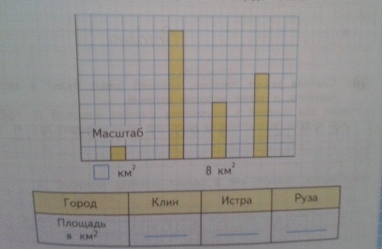 На диаграмме показаны площади трёх городов Подмосковья: Истры, Клина и Рузы. Определи масштаб в котором построена диаграмма и запиши в таблице площадь каждого города, если площадь Рузы больше ,чем площадь Истры, но меньше чем площадь Клина .