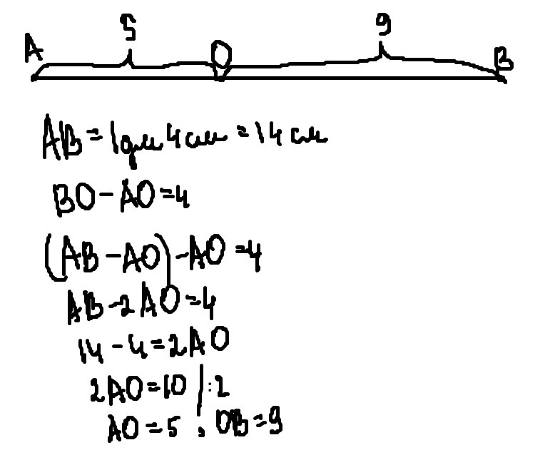 начерти отрезок АБ длиной 1дм 4см. отметь на нем точку О так, чтобы длина отрезка АО была на 4см меньше длины отрезка ОБ