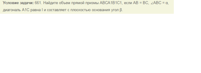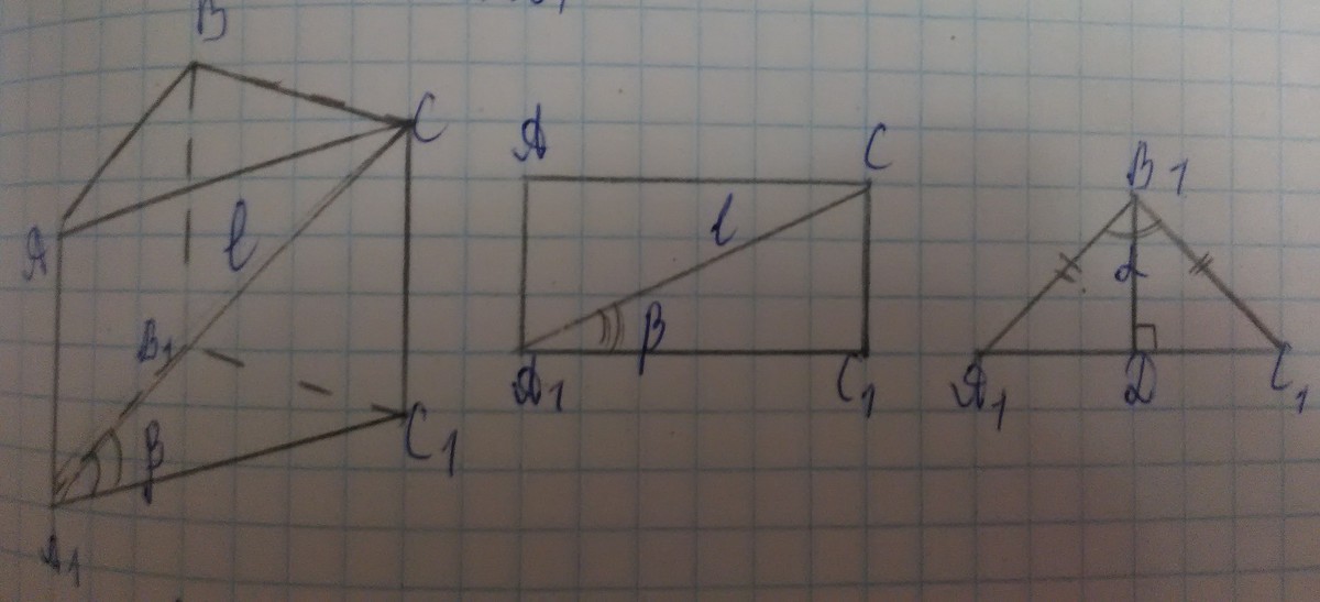 V=S_{osnov.}cdot H=frac{1}{2}cdot A_1B_1^2cdot sin alpha cdot CC_1\\CC_1=A_1Ccdot sin beta =lcdot sin beta \\A_1C_1=A_1Ccdot cos beta =lcdot cos beta =2cdot A_1D; Rightarrow ; A_1D=frac{lcdot cos beta }{2}\\A_1B_1=frac{A_1D}{sinfrac{ alpha }{2}}=frac{lcdot cos beta }{2cdot sinfrac{ alpha }{2}}\\V=frac{1}{2}cdot frac{l^2cdot cos^2 beta }{4cdot sin^2frac{ alpha }{2}}cdot sin alpha cdot lcdot sin beta =