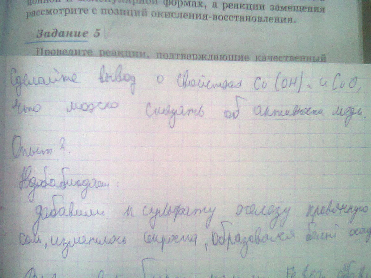 Сделать к опыту вывод и составить уравнение ( в 1 опыте уже составлено) Сделать реакции ионного обмена и записать также в ионной форме