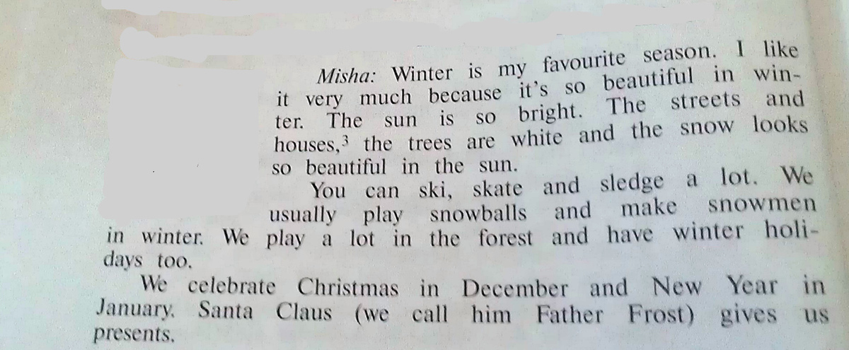 Миша: Зима - моё любимое время года.Мне нравится зима потому, что она прекрасна.Такое яркое солнце.Улицы и дома, деревья белые и снег прекрасен в лучах солнца.