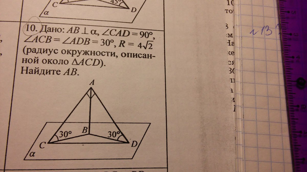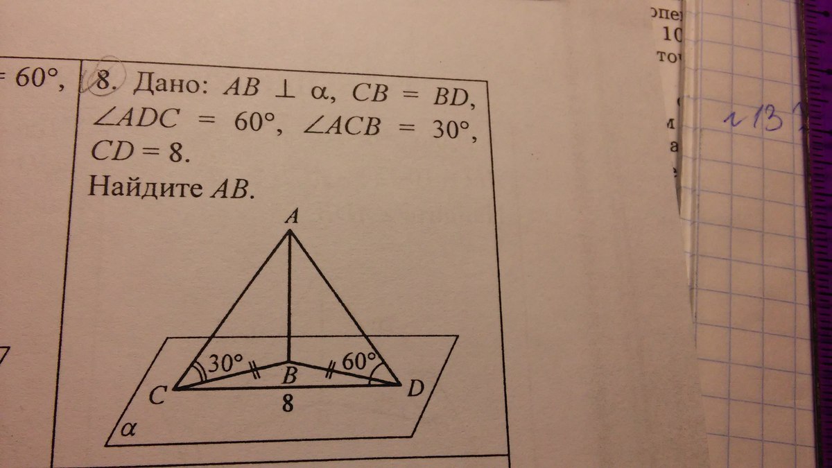 8) Из равенства треугольников АВС и АВД следует, что стороны АС и АД равны, поэтому треугольник АСД равносторонний и углы в нём по 60°, а стороны по 8. Тогда АВ = АС*sin 30° = 8*0,5 = 4.