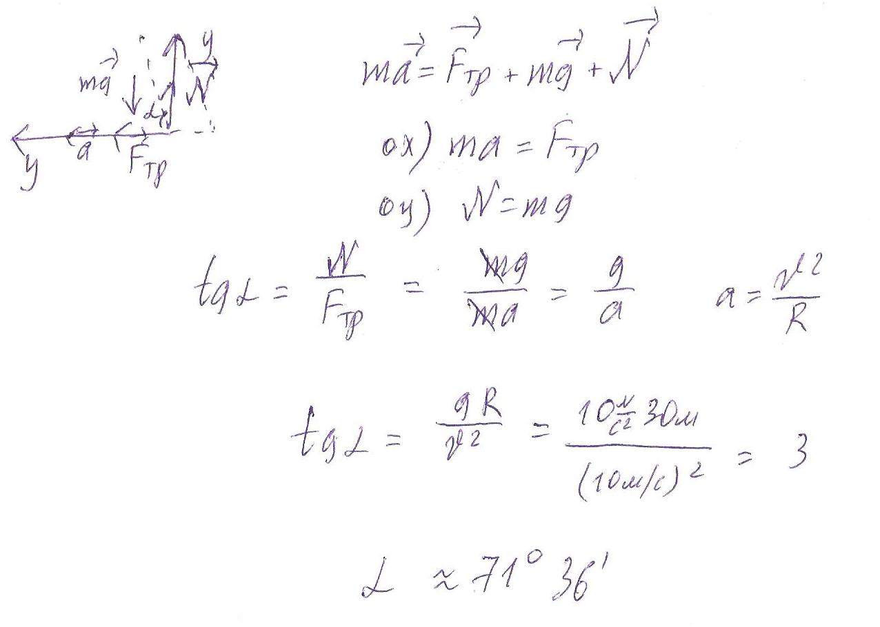 Конькобежец движется со скоростью 10 м/с по окружности радиусом 30 м. Под каким углом к горизонту он должен наклониться, чтобы сохранить равновесие?