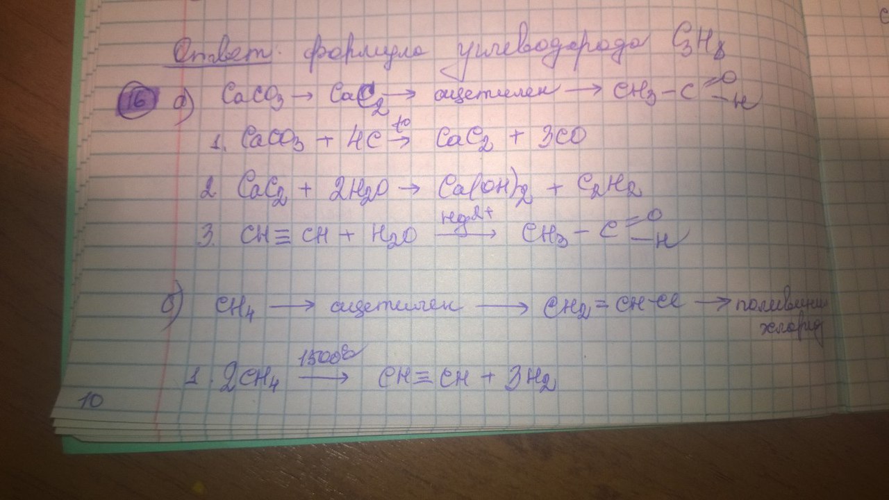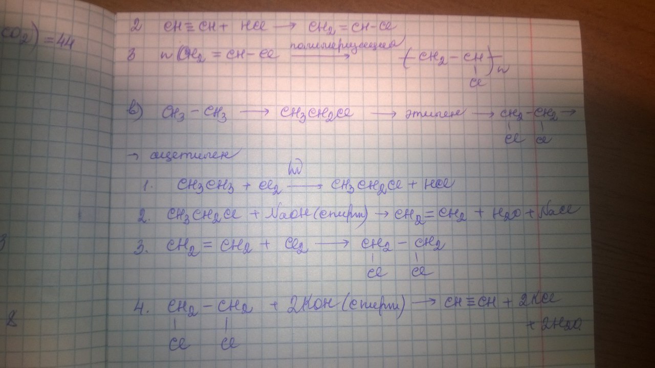 1. CaCO3 → CaC2 → CH≡CH→ CH3-C сверху О, снизу H 2. СH4 → CH≡CH→CH2 = CHCL → (-CH2-CH-)n Под CH в скобках написан Cl 3. CH3→CH3→CH3-CH2Cl→CH2=CH2→CH2Cl-CH2Cl→CH≡CH
