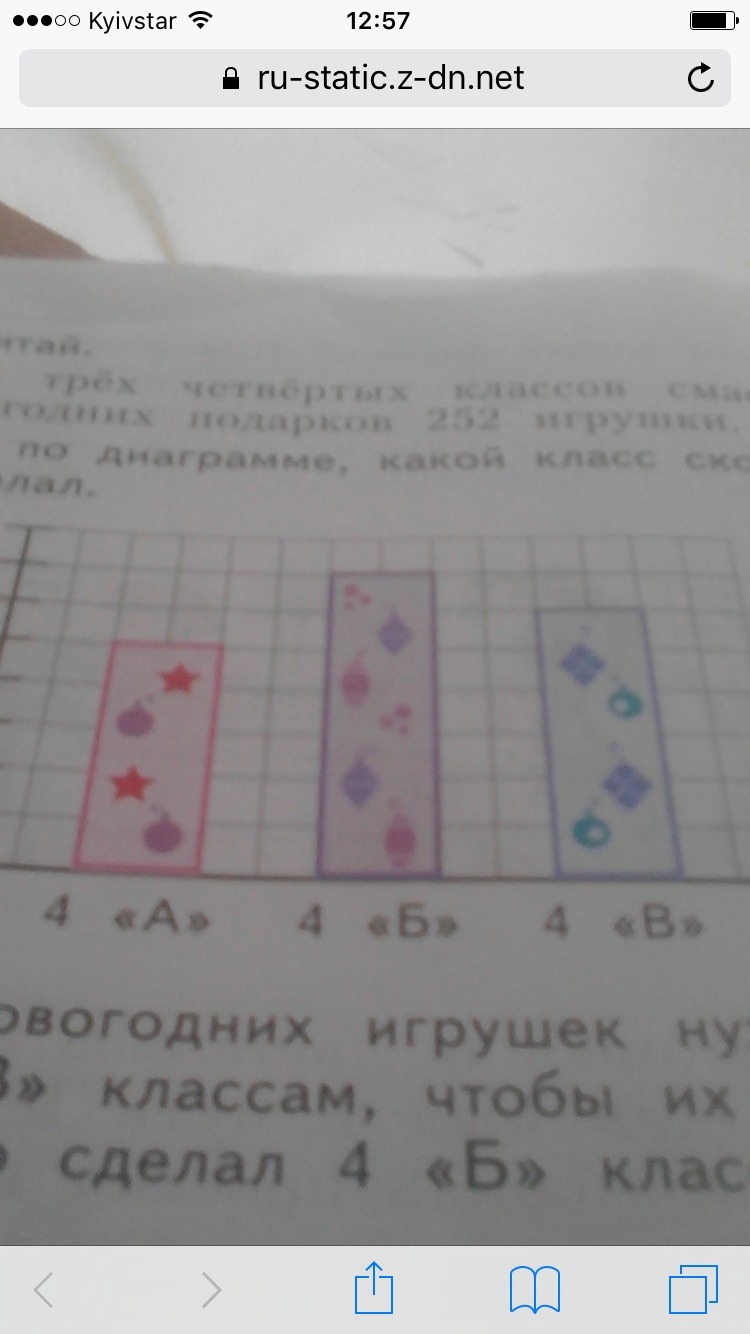 Ученики трех четвёртых классов смастерили для новогодних подарков 252 игрушки.Сколько новогодних игрушек нужно сделать 4А и 4В чтобы их было столько же сколько сделал 4Б класс?Помогите очень прошу заранее спс