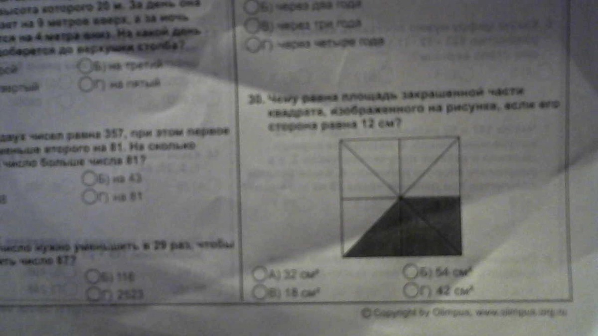 Чему равна площадь закрашенной части квадрата,изображённого на рисунке,если его сторона равна 12 см ?