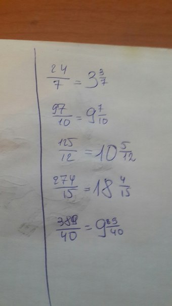 запиши у вигляди неправильного дробу и видели з нього цилу частину: 24:7; 97:10; 125:12; 274:15; 389:40