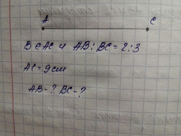 9 см подели на 5 равных отрезка. Выдели 2 отрезка и там поставь точку (точка В) потом остальные отрезки будут соответствовать)) И отсюда следует, что 2:3.