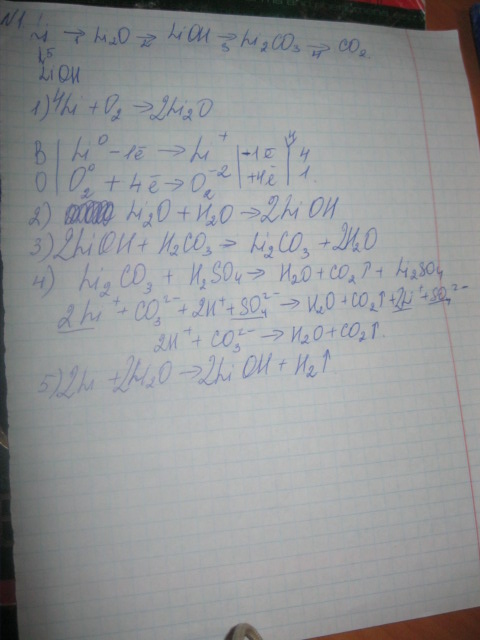Дана схема превращений: Li→Li₂O→LiOH→Li₂CO₃→CO₂ стрелочка от Li→LiOH это пятая реакция.