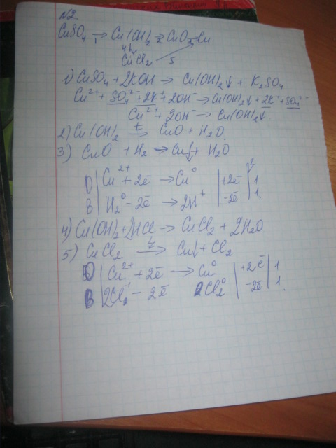 Дана схема превращений: CuSO₄→Cu(OH)₂→CuO→Cu первые три реакции. Cu(OH)₂→CuCl₂→Cu следующие 2.