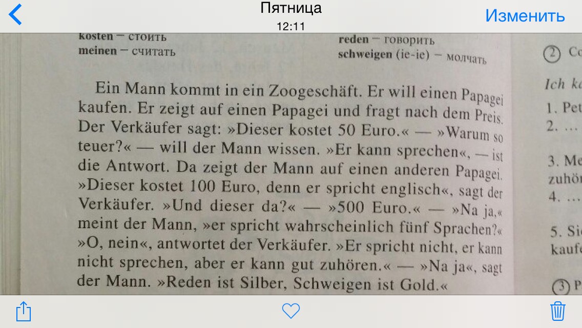 Мужчина пришел в зоомагазин. Он хотел купить попугая. Он показал на попугая и спросил его цену. Продавец ответил: "Этот стоит 50 евро". - "Почему так дорого?" - поинтересовался мужчина. - "Он может разговаривать", - последовал ответ. Тогда мужчина указал на другого попугая. "Этот стоит 100 евро, потому что говорит по английский" - сказал продавец. - "А этот?" - "500 евро". - "Ну да, - предположил мужчина, - вероятно он говорит на пяти языках?" - "О, нет, - ответил продавец, - он не говорит, он не может говорить, но может очень хорошо слушать". - "Ну да, - сказал мужчина, - слово - серебро, молчание - золото"