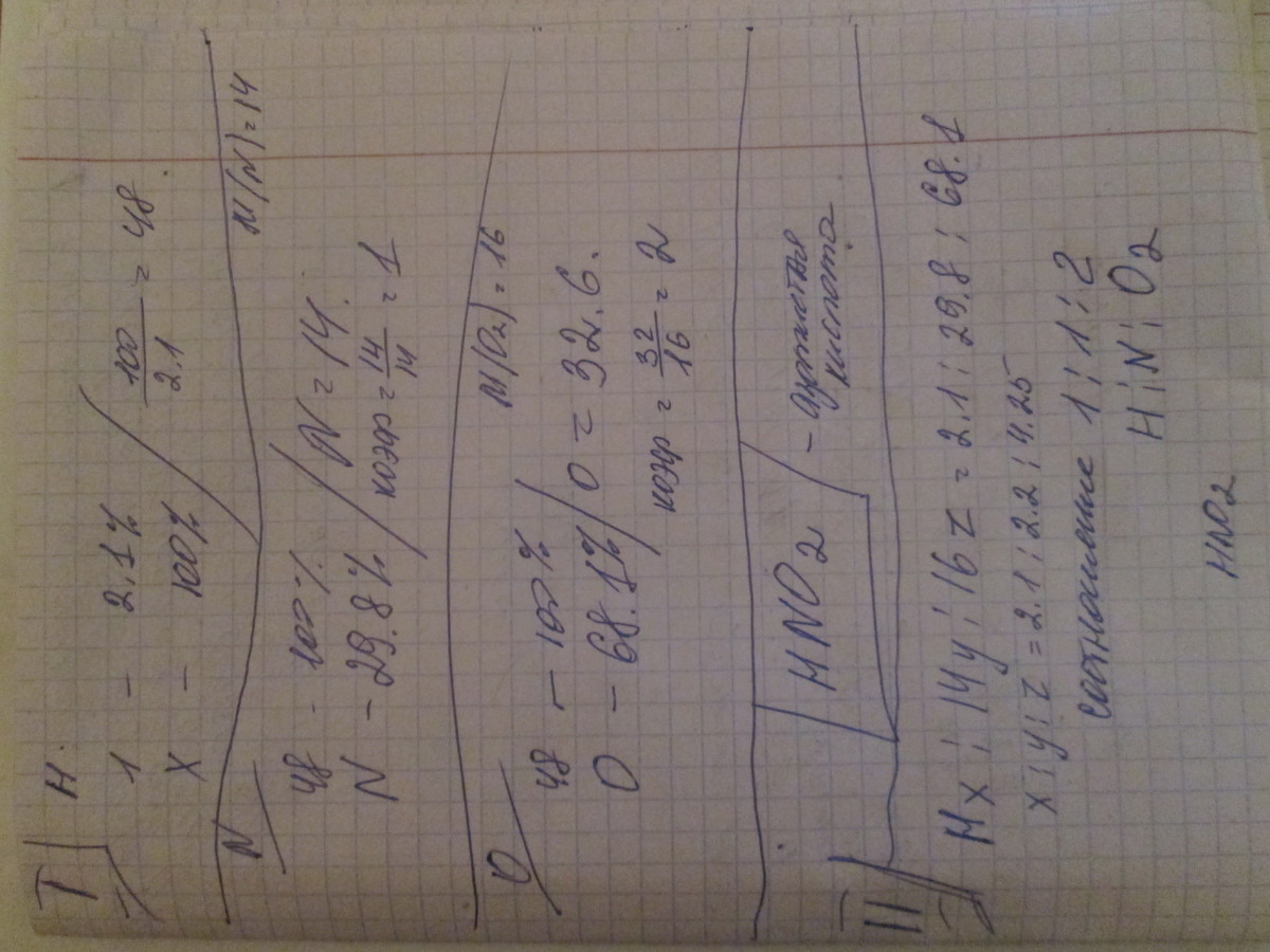 Одна из кислот,полученных синтетическим путём,имеет следующий состав: H-2,1%, N-29,8% и O-68,1%. Найти её формулу