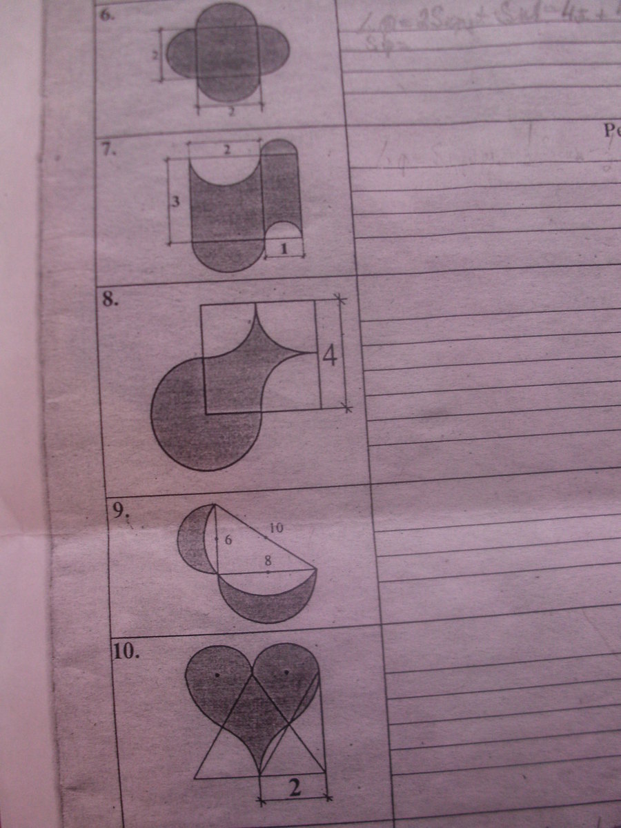Площадь прямоугольника со стороной 4 и 2. Вычесть из этой площади площадь половины круга с радиусом 2 (две четвертинки). Затем прибавить половину площади круга с радиусом 2 и площадь круга с радиусом 1 (две верхних половинки у "сердечка").