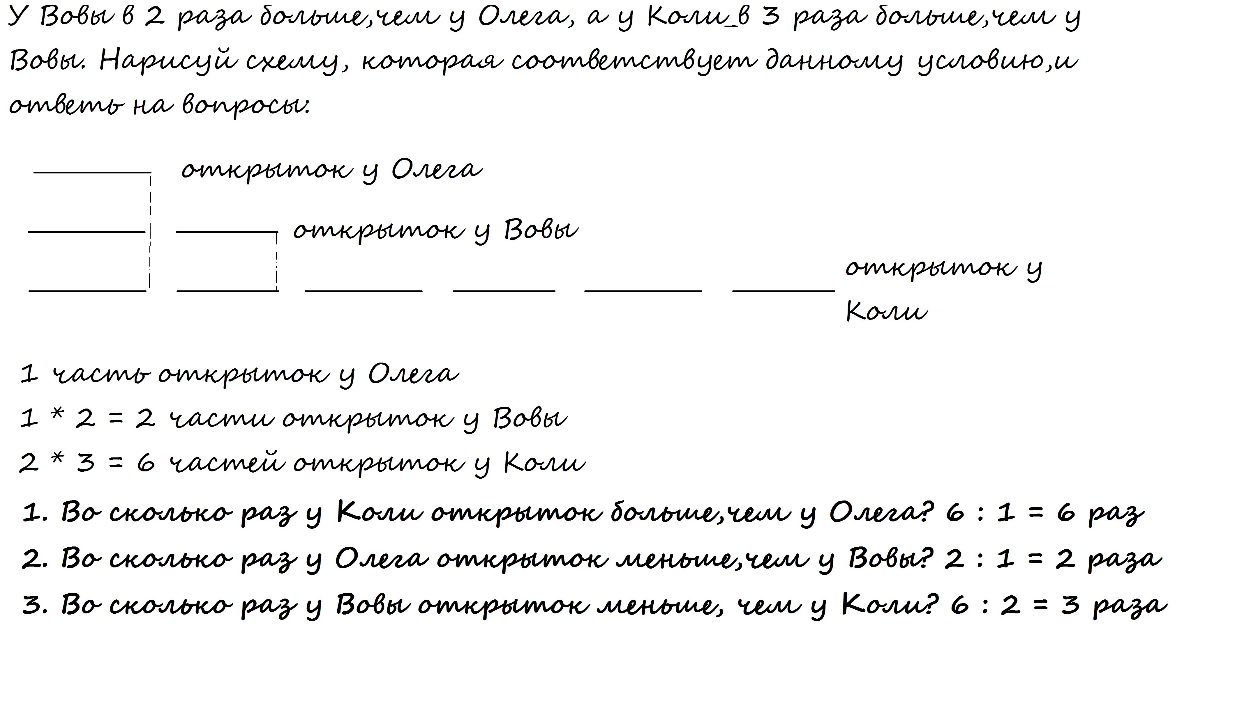 У Вовы в 2 раза больше,чем у Олега, а у Коли_в 3 раза больше,чем у Вовы. Нарисуй схему, которая соответствует данному условию,и ответь на вопросы: 1. Во сколько раз у Коли открыток больше,чем у Олега? 2. Во сколько раз у Олега открыток меньше,чем у Вовы? 3. Во сколько раз у Вовы открыток меньше, чем у Коли?