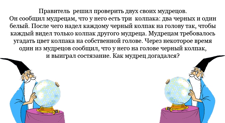 Мудрец рассуждал так: - Я вижу перед собой черный колпак. Предположим, что на мне белый. Тогда второй мудрец, видя перед собой белый колпак, должен рассуждать так: "Если на мне нём белый колпак, значит, у меня черный". Ион бы сразу сказал,что у него чёрный, так как белый колпак-один.
