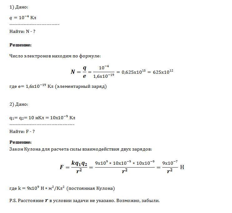 №1Какое число электронов соответствует заряду q=-1,0*10(-4 степени) Кл