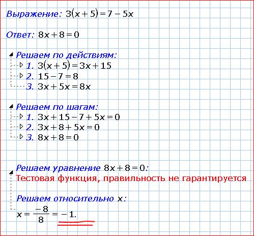 3(x+5)=7-5x 3x+15=7-5x 3x+5x=7-15 8x=-8 x=-8:8 x=-1