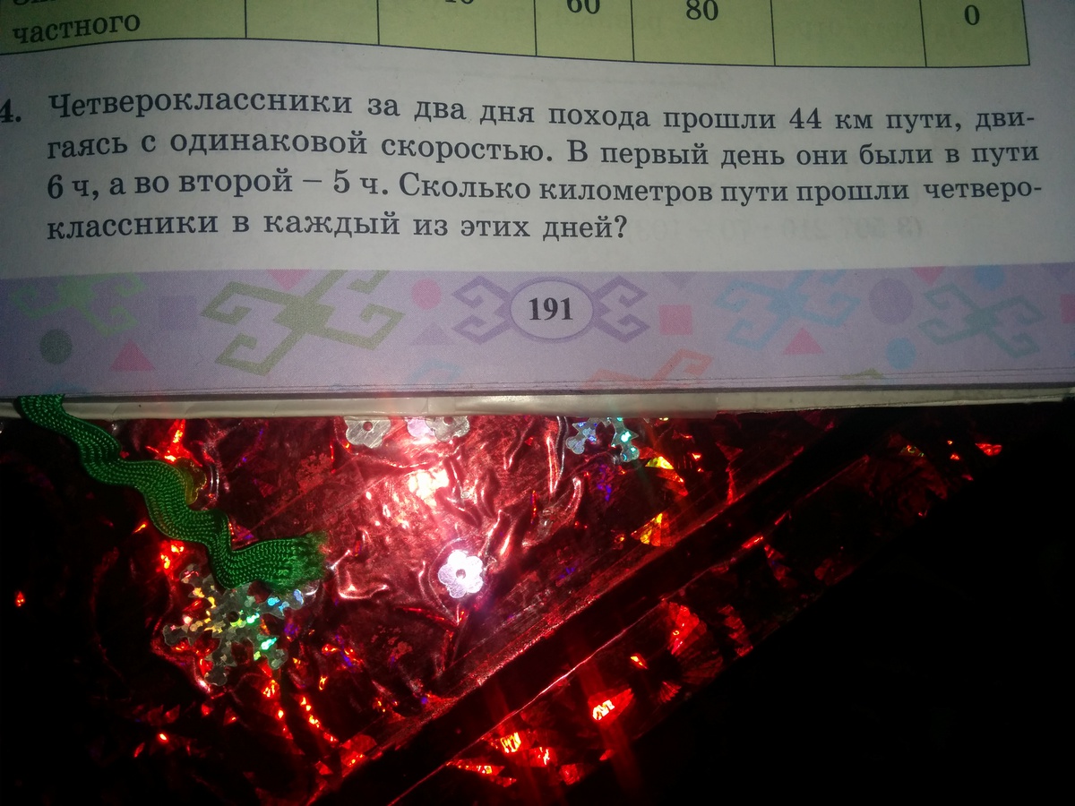Четвероклассники за два дня похода прошли 44 км пути двигаясь с одинаковой скоростью . Первый день они были в пути 6 часов а второй 5 часов. Сколько километров пути прошли четверо классники в каждый из этих дней?