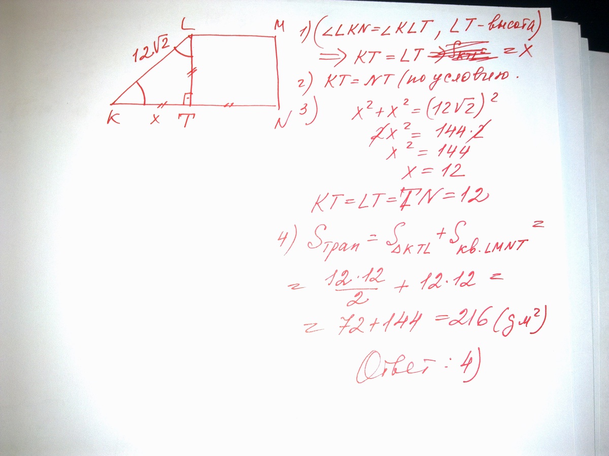 KLMN - прямоугольная трапеция. Боковая сторона KL= 12 корень из 2 дм, угол LKN=углу LKT, LT- высота, опущенная из вершины тупого угла, делит основание KN пополам. Найдите площадь трапеции.