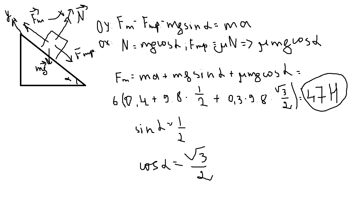 Какую силу необходимо приложить к телу массой 6 кг, чтобы оно перемещалось вверх по наклонной плоскости с ускорением 0,4 м/с2? Наклонная плоскость составляет с горизонтом угол 30°, а коэффициент трения равен 0,3.