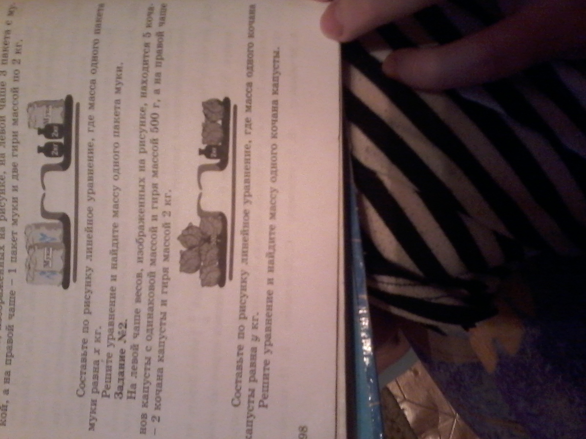 На левой чаше весов, находится 5 коченов капусты с одинаковой массой и гиря массой 500 грамм, а на правой чаше 2 кочена капусты и гиря массой 2 кг. Составь линейное уравнение, где масса одного кочена капусты равна y килограмм