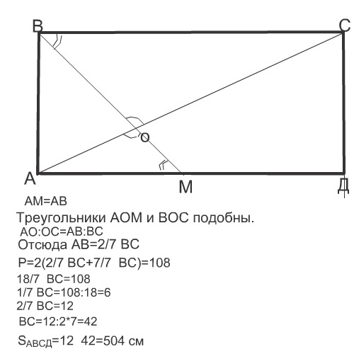 бісектриса кута прямокутника ділить його діагональ у відношенні 2 до 7, а периметр = 108 см. Знайти його площу.
