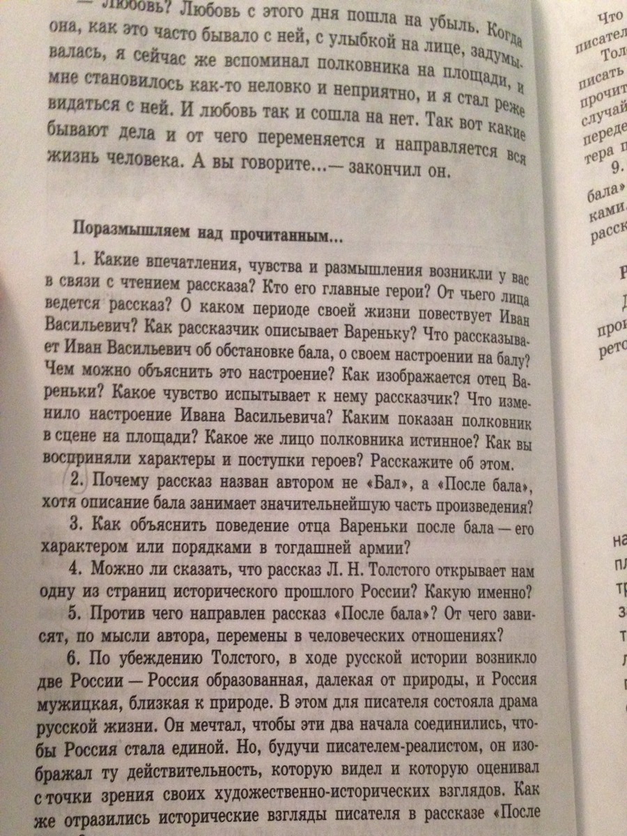 2) Рассказ назван "после бала" т.к. именно после "основного" действия мы видим настоящую сущность людей - публичная порка(казнь) человека (в этом действии показана вся жестокость, ненависть, властелюбство). Для обращения внимания на сей порок общейства и было выбрано такое название.
