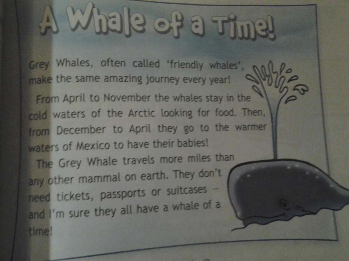 Серый кит путешествует много миль, больше, чем любое другое млекопитающее. Им не нужны билеты, паспорта и чемоданы, я уверена, что они замечательно проводят время.