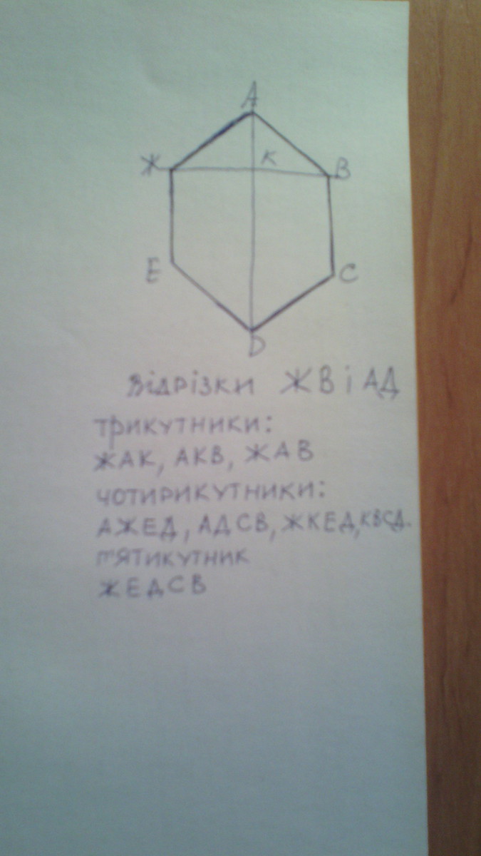 побудуй шестикутник.поділи його двома відрізками так щоб утворилися 3 трикутника 4 чотирикутника і 1 п ятикутник