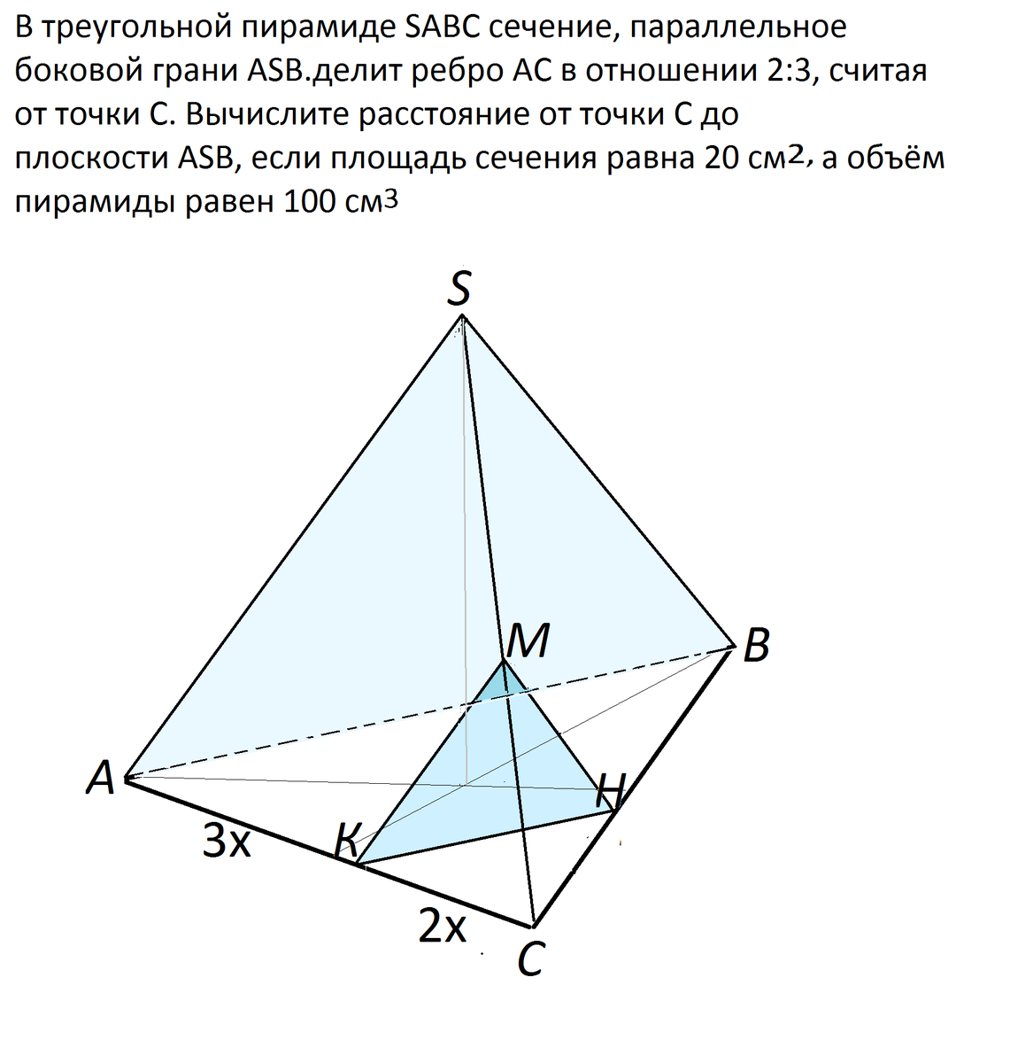 В треугольной пирамиде SABC сечение, параллельное боковой грани ASB.делит ребро АС в отношении 2:3, считая от точки С. Вычислите расстояние от точки С до плоскости ASB, если площадь сечения равна 20 см2, а объём пирамиды равен 100 см3