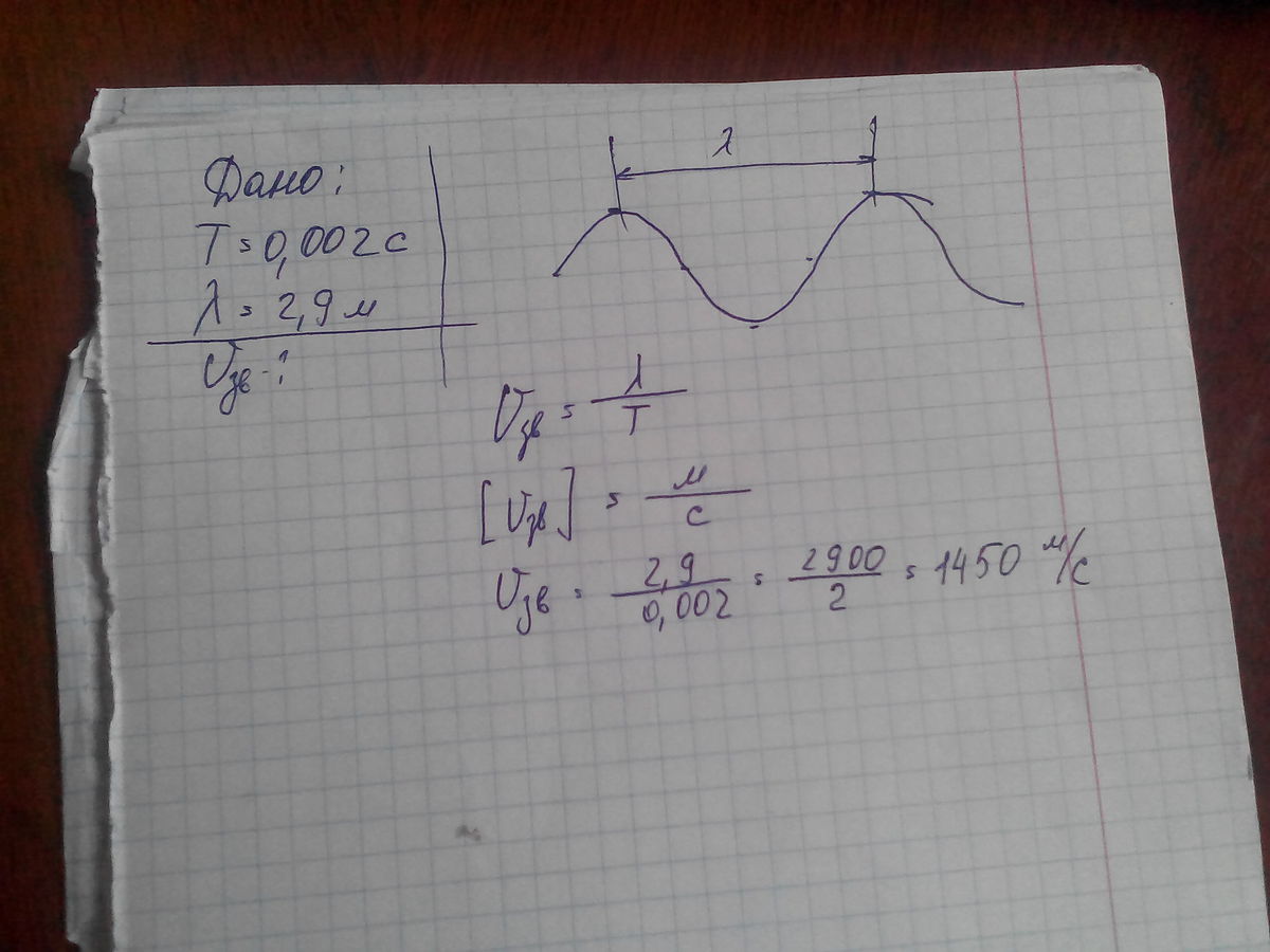 Опредилите скорость звука в воде,если источник ,колеблющийся с периодом 0,002с,возбуждает в воде волны длины 2,9м.