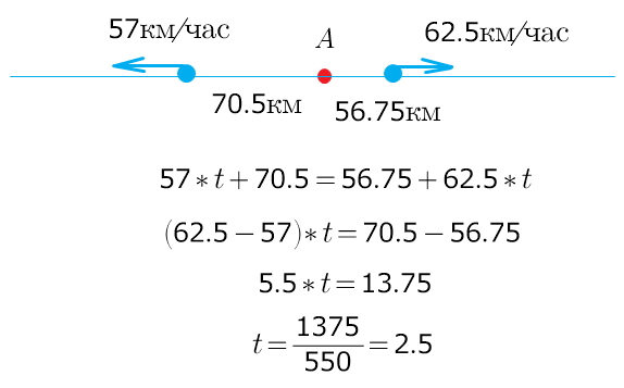 два поезда движутся в противоположных направлениях от станции А.От станции А первый поезд находится на расстоянии 70,5 км ,а второй поезд на расстоянии 56,75 км.Первый поезд едет со скоростью 57 км/ч ,а второй поезд со скоростью 62,5 км/ч.Через сколько часов оба поезда будут находиться на одинаковом расстоянии от станции А?.ПОМОГИТЕ нужно решить линейным уравнением